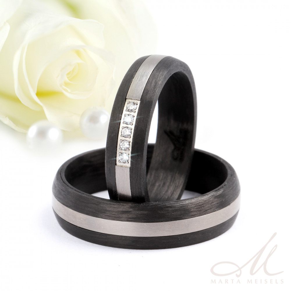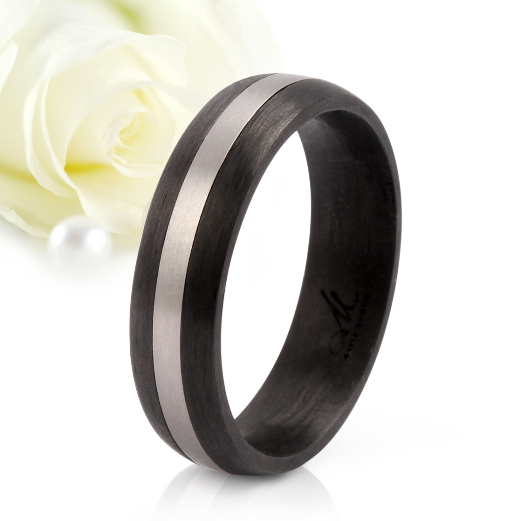 Különleges, high-tech fekete karbon anyagú férfi karikagyűrű középen matt felületű titán sávval. Ez a gyűrű egy igazán különleges és lenyűgöző darab, amely eleganciával és stílussal fogja fémjelezni az Ön személyiségét.