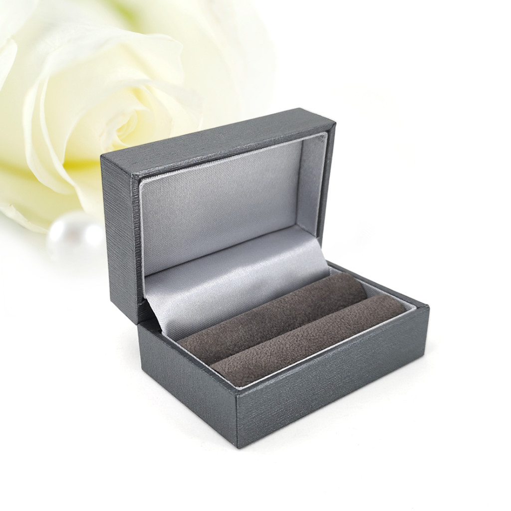 Modern stílusú, garantáltan exkluzív minőségű ezüstszürke színű műbőr karikagyűrű doboz, szürke plüss belsővel.